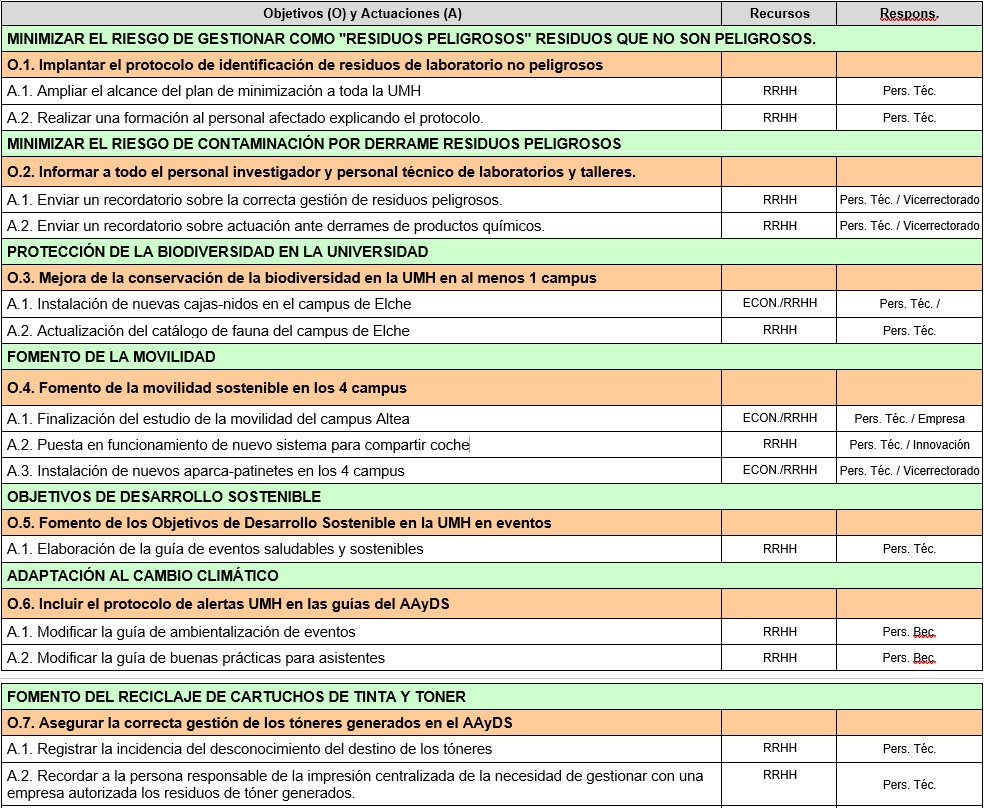 La Universidad Miguel Hernández de Elche (UMH), a través del Área Ambiental y Desarrollo Sostenible (AAyDS), cuenta con la Certificación Internacional ISO 14001:2015 de AENOR para sus actividades de sensibilización ambiental y voluntariado, así como para el seguimiento de la gestión de los residuos peligrosos. (Solicitud de copia del Certificado)
